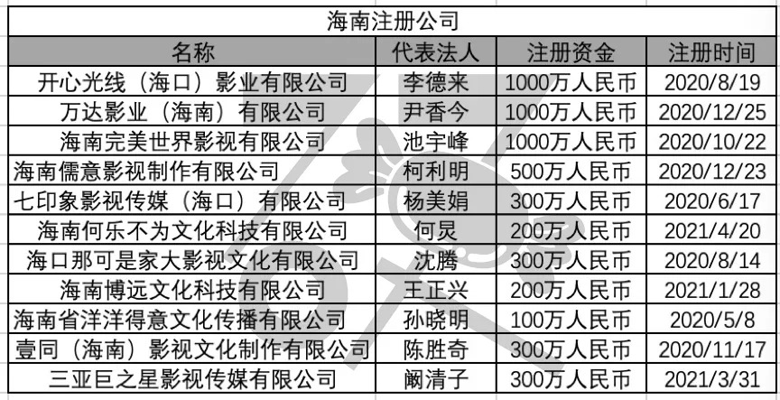 而当硬糖君翻开近一年海南注册公司名单,发现海南几乎囊括了整个头部影视圈资源。