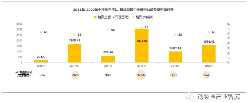 2020年数字疗法-慢病管理领域发生62起融资事件,累计融资近16亿美元,同比增加60%;而单笔融资平均融资金额已超过2500万美元,远超2019年的近1800万美元。