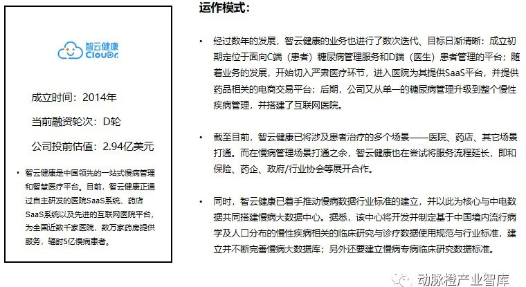在以上六家企业中,除了Pear Therapeutics与Quartet Health专攻心理障碍数字疗法外,其他企业都从单一病种的数字化管理逐渐发展出综合慢病管理业务。如智云健康成立初期定位于面向C端(患者)糖尿病管理服务和D端(医生)患者管理的平台,后续的线上管理业务则覆盖了综合慢病领域。
