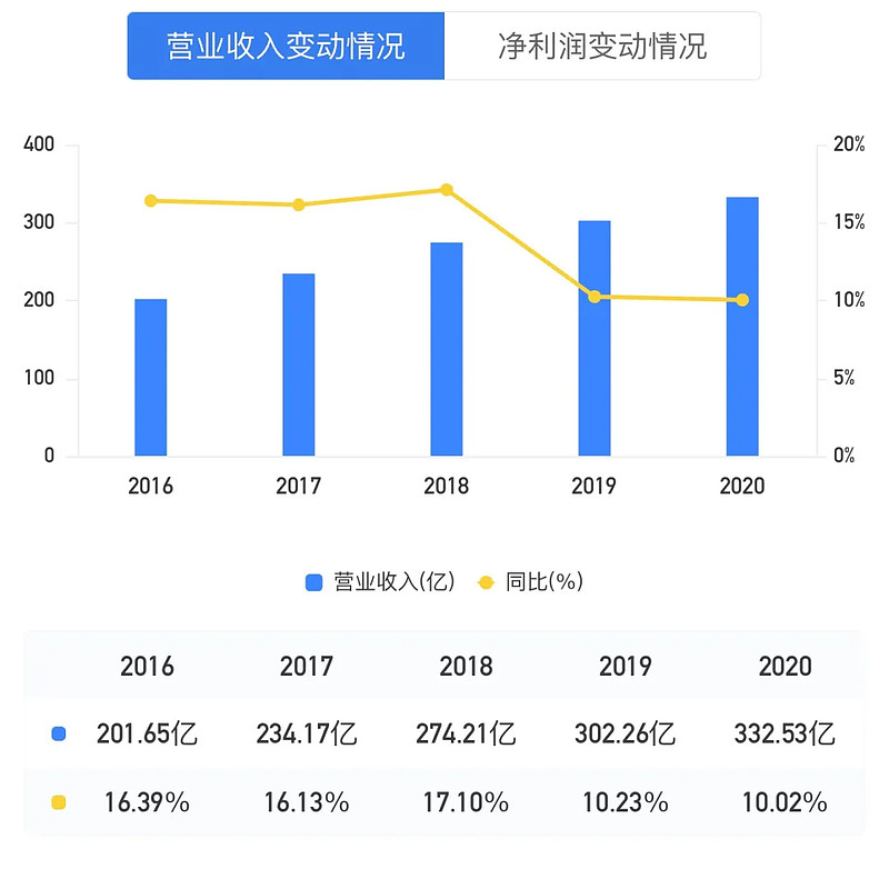 从公司营收角度看,2020年的年报,是正泰电器上市多年以来的最好成绩。公司从2016年的202亿元营收,通过多年努力将该数据提升至332.53亿元之多,提升额达130多亿元。而且仅从2016年算起,每年正泰电器的营收同比都是增长的,实属难得。