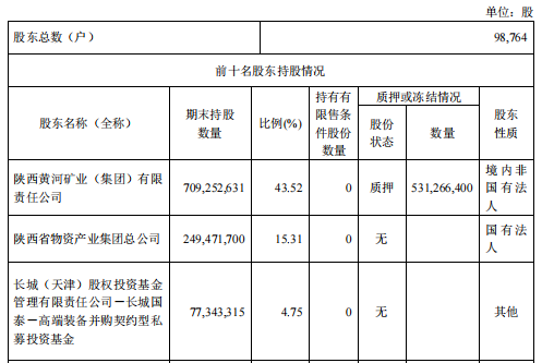 此外,陕西黑猫前三名股东分别是:陕西黄河矿业(集团)有限责任公司、陕西省物资产业集团总公司、长城(天津)股权投资基金管理有限责任公司,分别持有股份比例为:43.52%、15.31%、4.75%。值得注意的是,陕西省物资产业集团总公司为国有企业,资产稳定,风险较小。