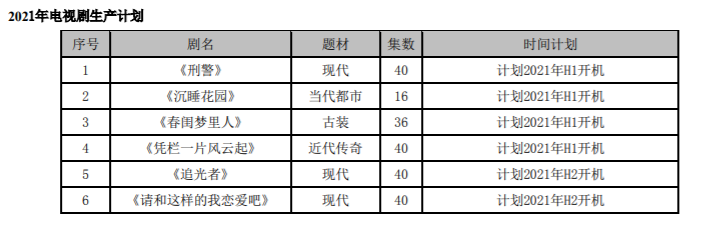 根据年报显示,华策影视是第一批申请并恢复影视剧拍摄工作的企业之一,并克服影视剧各生产要素大量时间错配的困难,确保了全年项目开机量。2020年,华策影视电视剧开机16部573集,比上年同期多112集。其中,第一季度开机项目1个,第二季度开机4个,第三季度开机5个,第四季度开机6个。