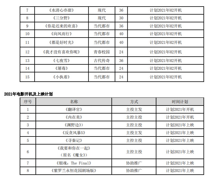 根据年报显示,报告期内开机的电视剧有2部、开机并已处于后期制作中的电视剧有8部,处于后期制作中的电影有4部,其中有两部主控主发,两部主控主投。在2021年,华策影视总共计划生产电视剧15部、计划开机及上映电影8部。