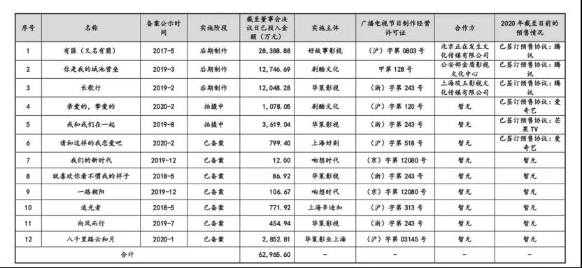 华策影视曾在公告中披露,2020年7月底之前,包括《有翡》《你是我的城池营垒》《长歌行》《亲爱的,挚爱的》《我和我们在一起》《请和这样的我恋爱吧》在内的6部剧都已完成预售,累计销售金额为18.58亿元。同期,正处在后期制作阶段的《长歌行》《你是我的城池营垒》分别累计投入金额为1.21亿元、1.27亿元。