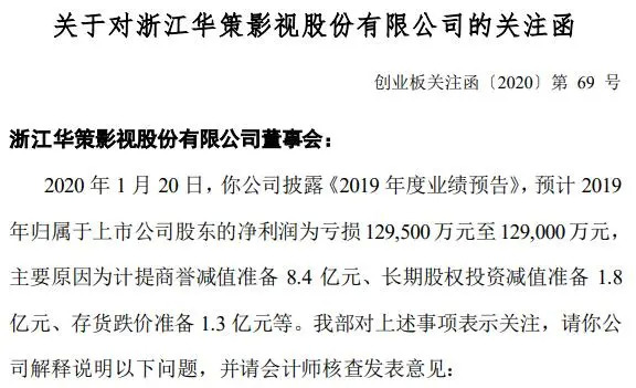 深交所就此事也下发了关注函,要求华策影视说明以前年度未计提减值准备但 2019 年度计提大额商誉减值的原因和合理性、计提减值准备的原因、公司是否存在通过计提大额资产减值准备调节利润的情形等六个问题。