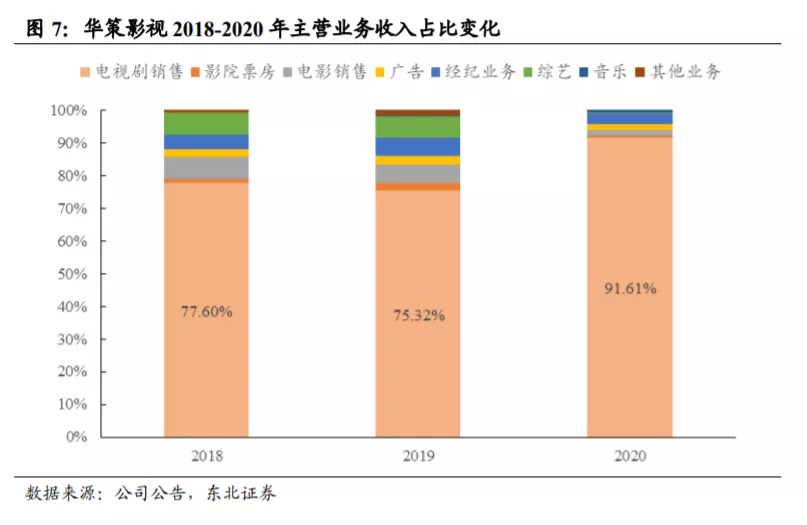 就营业收入的数据来看,在2020年,电视剧业务实现收入34.2亿元,相比2019年19.81亿元增长72.58%,占营收收入比重为91.61%,高于2019年、2018年的75.32%、77.60%。影院票房和电影销售业务分别实现收入0.16和0.67亿元,占营收收入比重分别达到0.42%和1.80%,收入同比分别减少75.92%和53.89%。