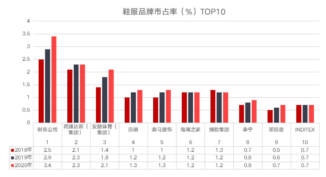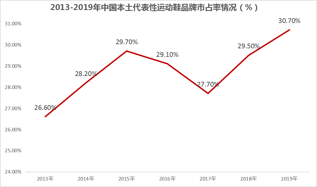 棉花事件后,一批国货运动品牌走到大众视觉中心。中国本土代表性运动鞋品牌市占率呈波动上升趋势,2019年CR4(安踏、李宁、特步、361°)达到30.7%。体现了中国本土运动鞋品牌高度集中、强者愈强的趋势。