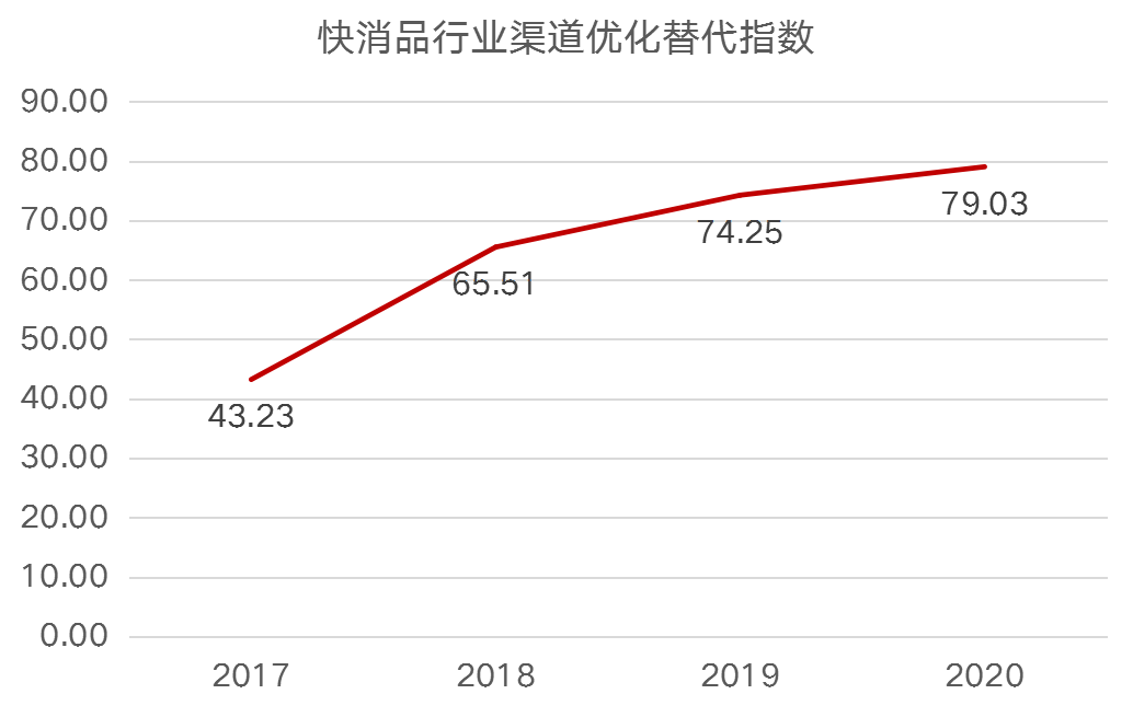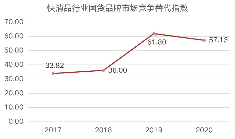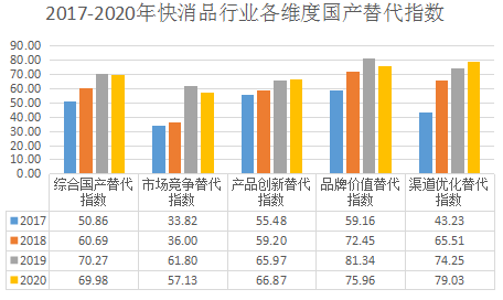 根据清博发布的《快消品行业国产替代指数报告》,将消费领域国产替代能力进行量化,2017-2020年快消品行业国货品牌的市场竞争、产品创新、品牌价值、渠道优化替代指数整体呈上升趋势。