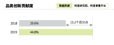 具体来看,阿里数据显示,2019年品类创新对国货发展的贡献度达44.8%,比2018年的贡献度大幅度提升15.2个百分点,助力国货品牌业绩与流量的双增长。