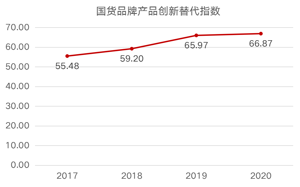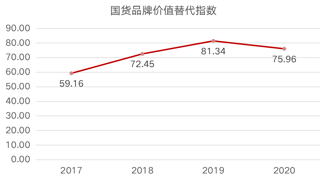 2017-2020年,在品牌价值层面,替代指数得分较高,说明替代效应很好。对于国内消费者,国货品牌天然具有亲和力,更易在产品创新上提高销量,在品牌价值上实现“品牌溢价”。