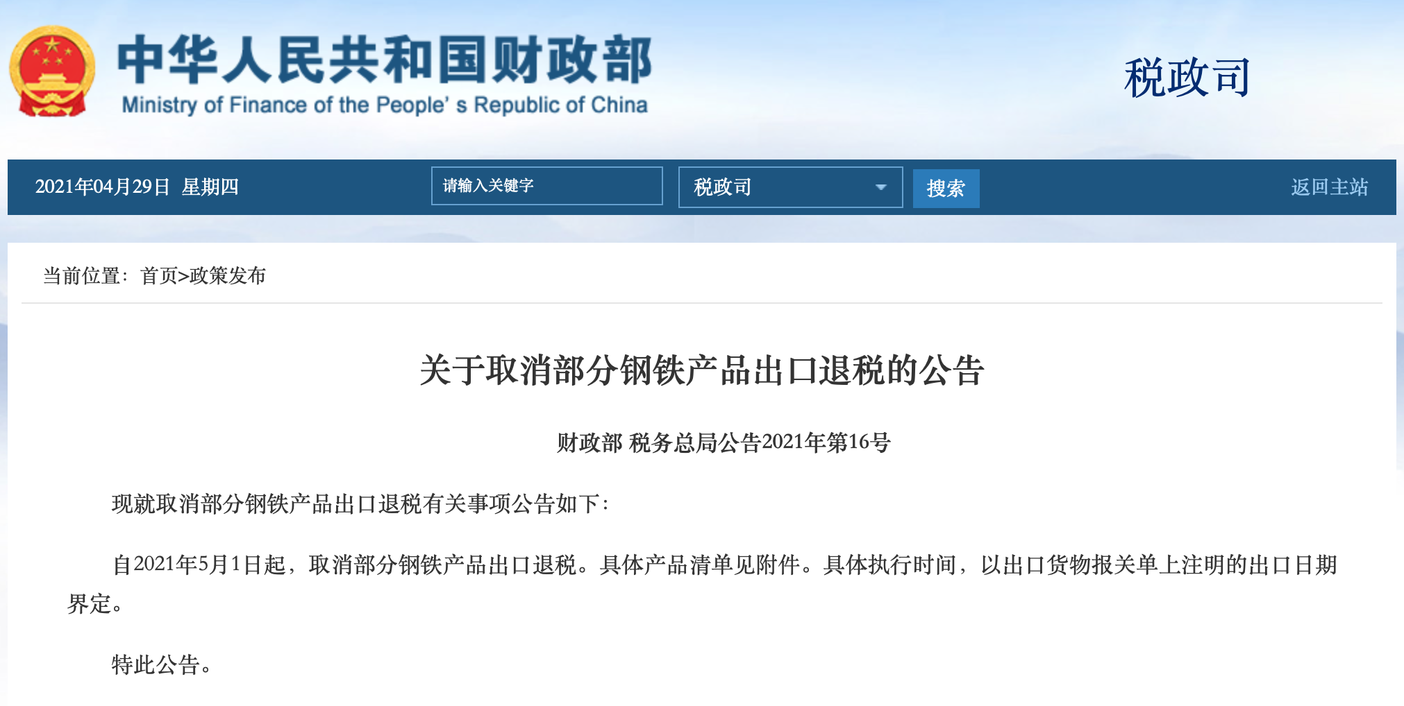 此外,财政部、国家税务总局28日联合发布公告称,自2021年5月1日起,取消部分钢铁产品出口退税。具体产品清单见附件。具体执行时间,以出口货物报关单上注明的出口日期界定。