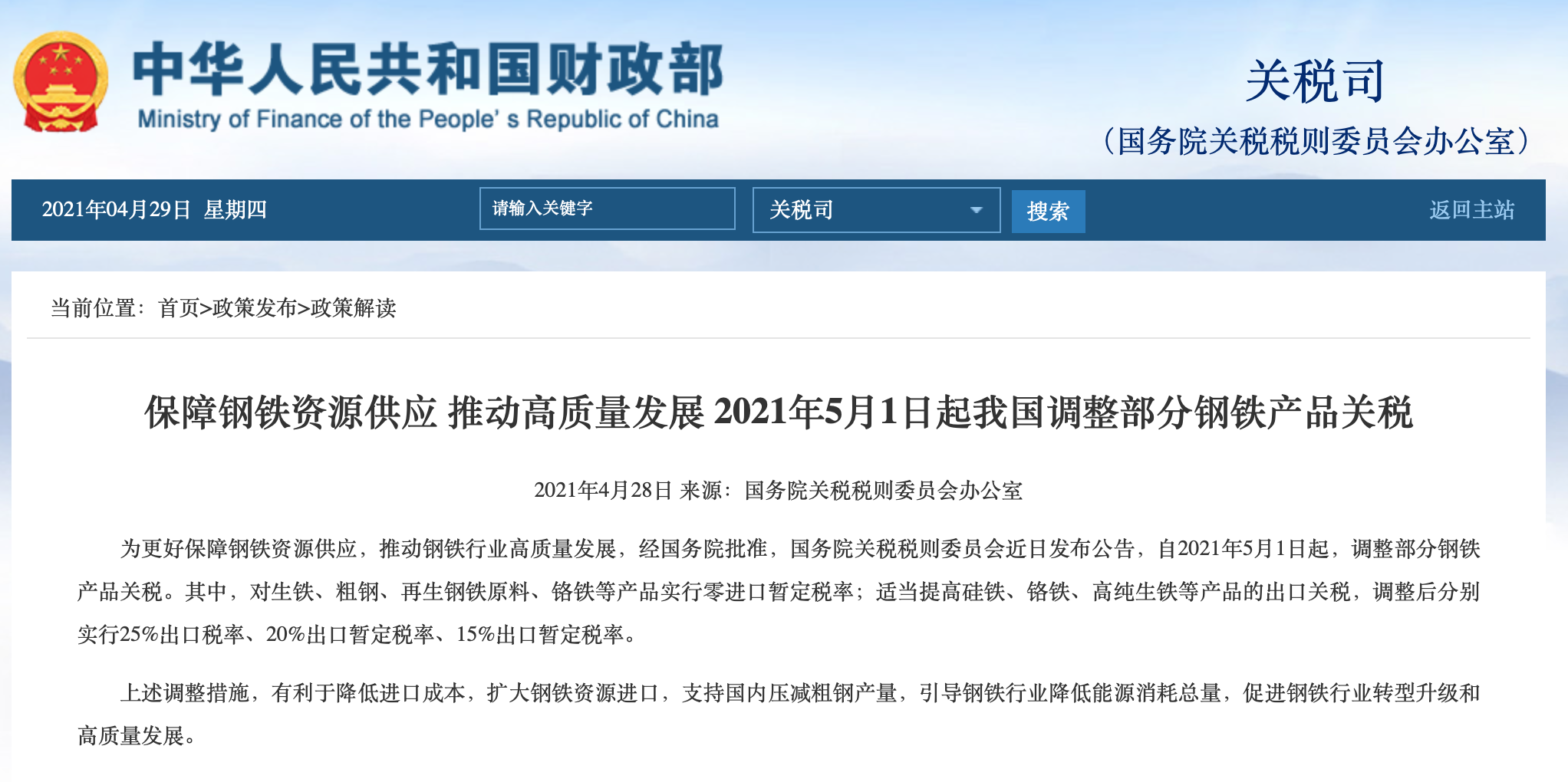 据财政部网站28日消息,为更好保障钢铁资源供应,推动钢铁行业高质量发展,经国务院批准,国务院关税税则委员会近日发布公告,自2021年5月1日起,调整部分钢铁产品关税。
