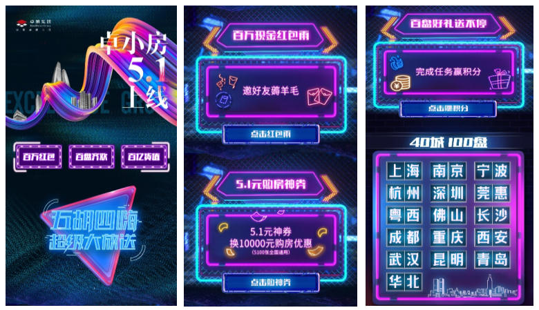 线上百万现金礼(红包雨)、积分好礼,线下到访有礼、认购大礼:五一活动期间,不管线上还是线下,所有卓小房用户每一次参与和体验都将领取官方壕礼,让你的购房体验一嗨到底。