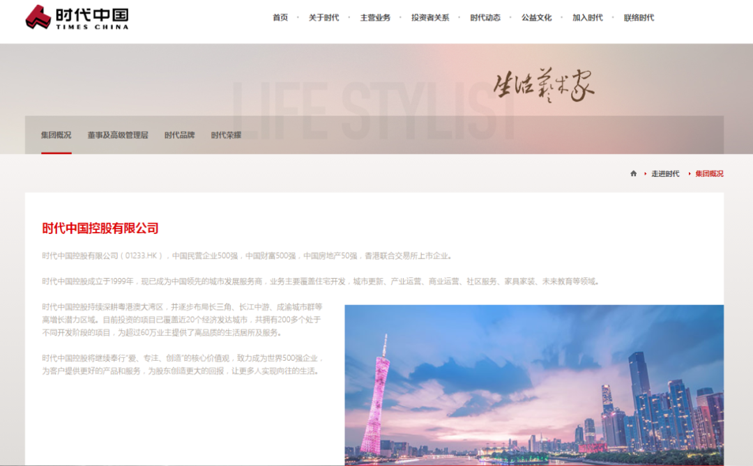 时代是中国房地产50强的民营企业,已在香港联合交易所上市,业务主要涵盖住宅开发,城市更新、产业运营、商业运营、社区服务、家具家装、未来教育等领域,深耕粤港澳大湾区,并逐步布局长三角、长江中游、成渝城市群等高增长潜力区域。目前投资的项目已覆盖近20个经济发达城市。