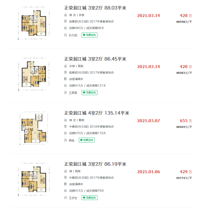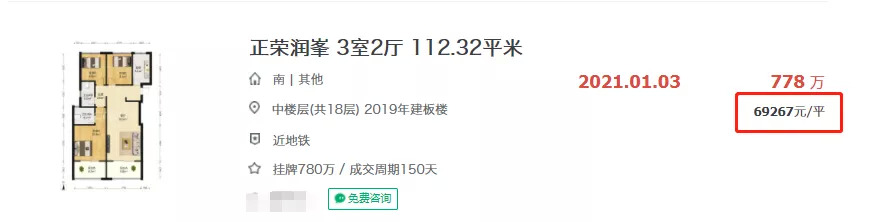 根据链家网显示,目前正荣润峯项目在二手房的挂牌均价约6.7万/㎡,而项目的成交价已突破6.9万/㎡。今年1月3日,一套112.32㎡的三室两厅房源,已总价778万成交,成交均价为69267元/㎡。当时震惊了南京楼市。