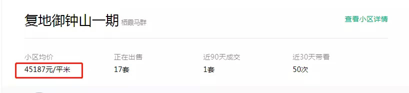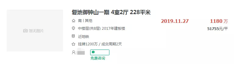 根据链家最新数据,目前复地御钟山一期的二手房均价为45187元/㎡,而近期成交的一套房源中,建筑面积约228㎡的,4室2厅,成交总价为1180万,成交单价为51755元/㎡。