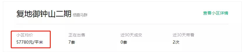 复地御钟山二期的二手房均价为57780元/㎡,最近成交的一套是建面约173.75㎡的6室3厅,成交总价940万,成交单价为54101元/㎡。