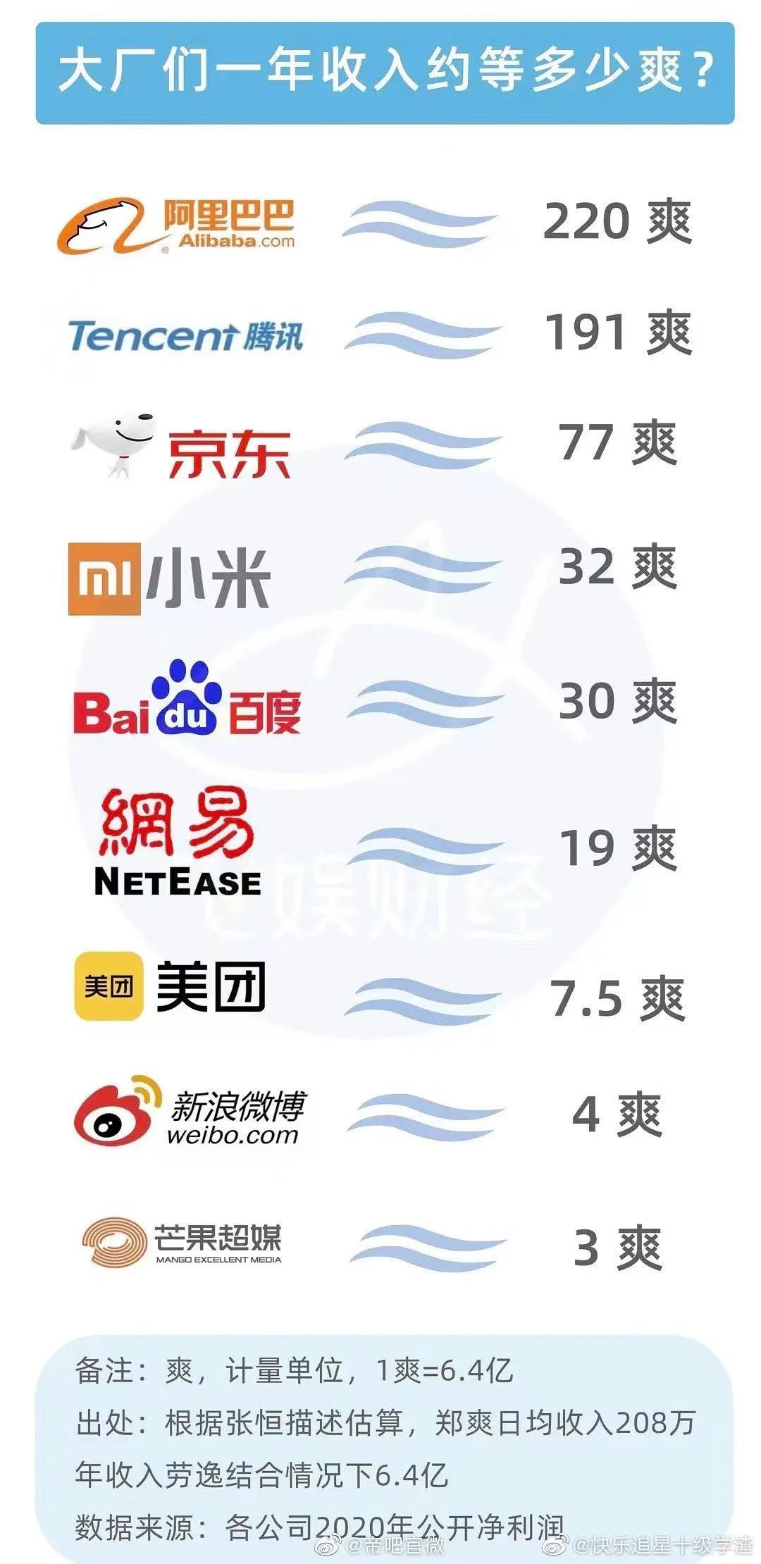 郑爽208万元的日薪,有人按照年薪计算大概是6.4亿,进一步根据这个数据可以算出大厂们一年收入大约等于多少个爽?其中阿里巴巴最多,一年可以挣220个爽,微博更少,仅仅相当于4个爽。