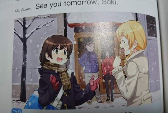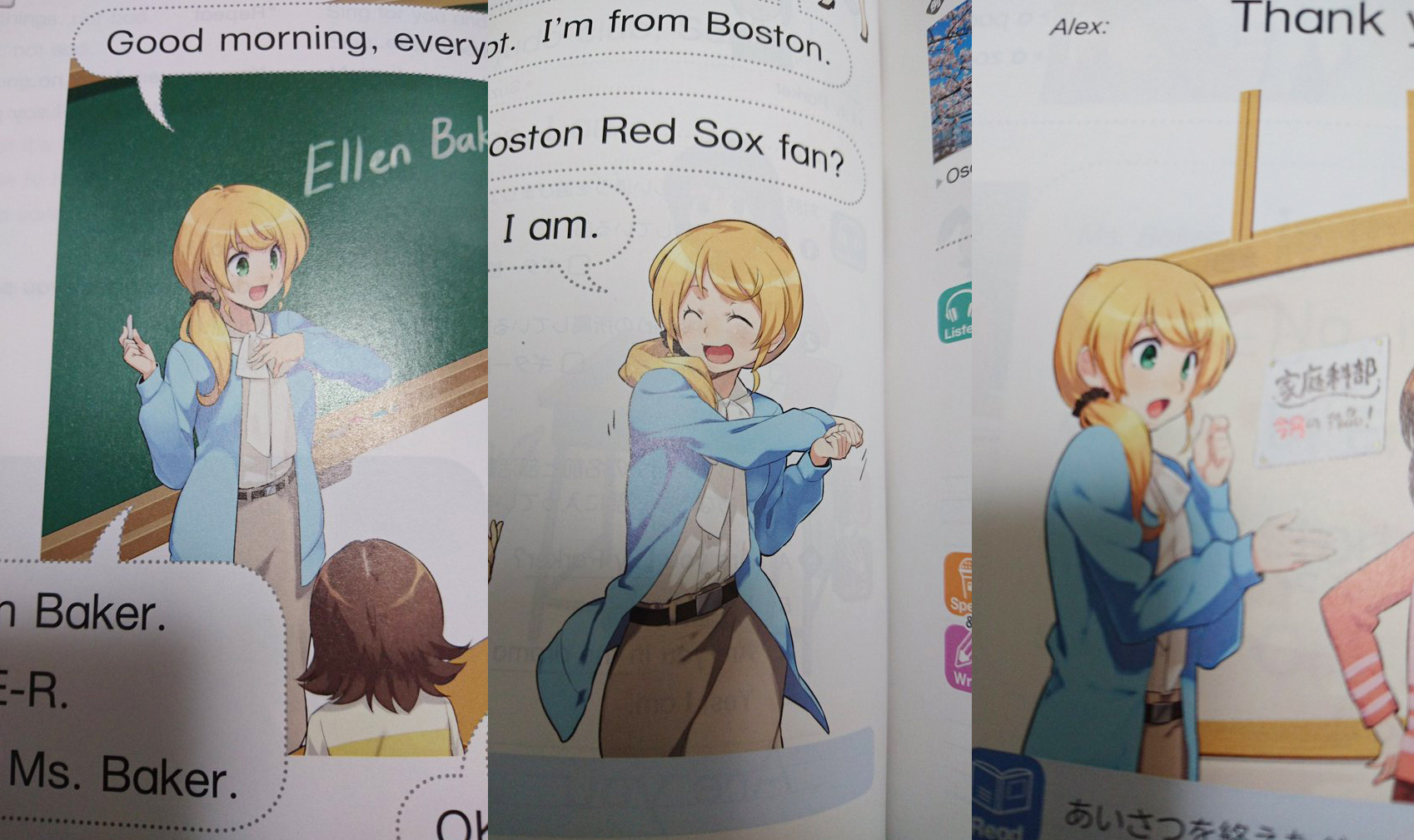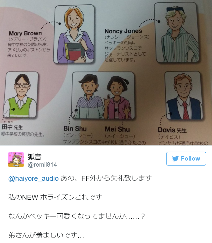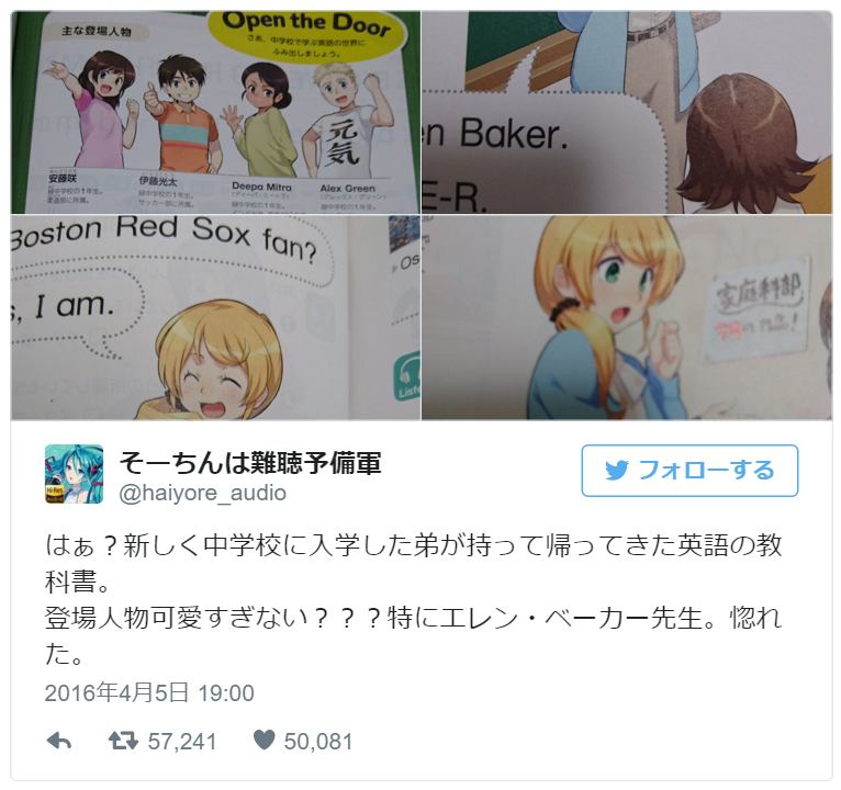 一位日本推主(@haiyore_audio)看到自家弟弟带回来的英语书激动地发了一条推,“登场人物也太可爱了吧?特别是艾伦·贝卡(Ellen Baker)老师,看着她简直有种陷入恋爱的感觉。”
