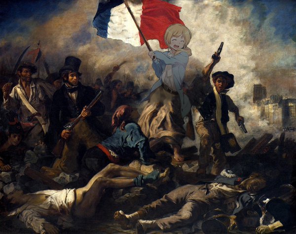 甚至还乱入到了世界名画里,举起了《自由引导人民》里的旗帜↓