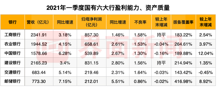 4月29日晚,国有六大行2021年一季报悉数出炉。