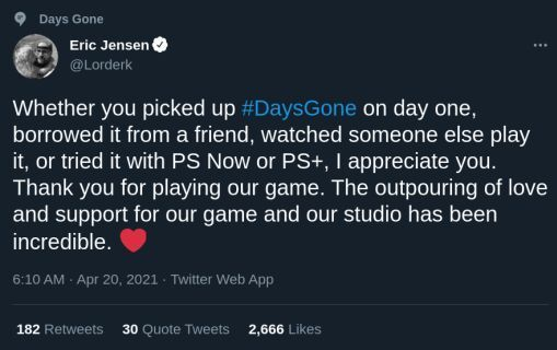 而且,明明离职了,却用这样的方式“背刺”老东家。幸亏后面《往日不再》另一位总监Eric Jensen出来发推 “无论你是购买还是租借,从PS Now或是PS+获取,甚至是从其他玩家那里观看,我都要向你们表示感谢。感谢所有体验到这款游戏的玩家。目前工作室已经收获了难以置信的爱与支持!