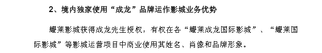 耀莱集团自2010年其便独家拥有成龙品牌,其投资的《天将雄狮》、《十二生肖》、《辛亥革命》和《大兵小将》也都和成龙相关。目前耀莱影城旗下拥有17家影院,其中部分影院就是以“耀莱成龙”命名。