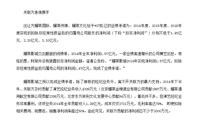 但这次收购也引发了媒体质疑。截至2014年12月31日,耀莱影城资产总计11.52亿元。根据文投控股披露数据显示,2013年和2014年分别实现营收4.13亿元和7.62亿元,获得净利润6642.36万元和1.57亿元。