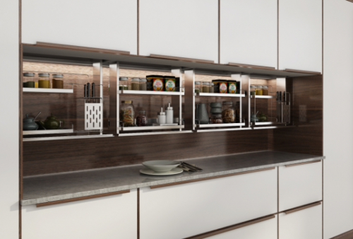 吊柜升降系统,合理分类归纳厨房所需的调味品与用具,并隐藏于厨柜之中,设计独特而不影响整体的美观。智能升降,即触即停的设计让使用变得更加方便。