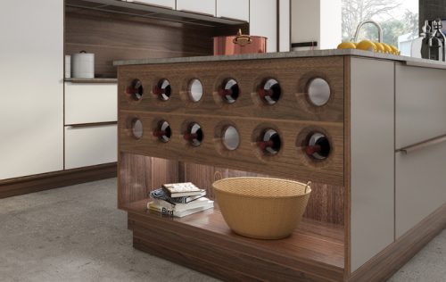 厨柜的一侧是隐秘安装的音响柜,每一次下厨的时候可以根据心情播放喜爱的歌曲,让下厨不再枯燥。另一侧是一个木质酒柜,来源火山口的灵感设计,令酒柜设计别具一格。音乐配红酒,生活精彩的处处有。