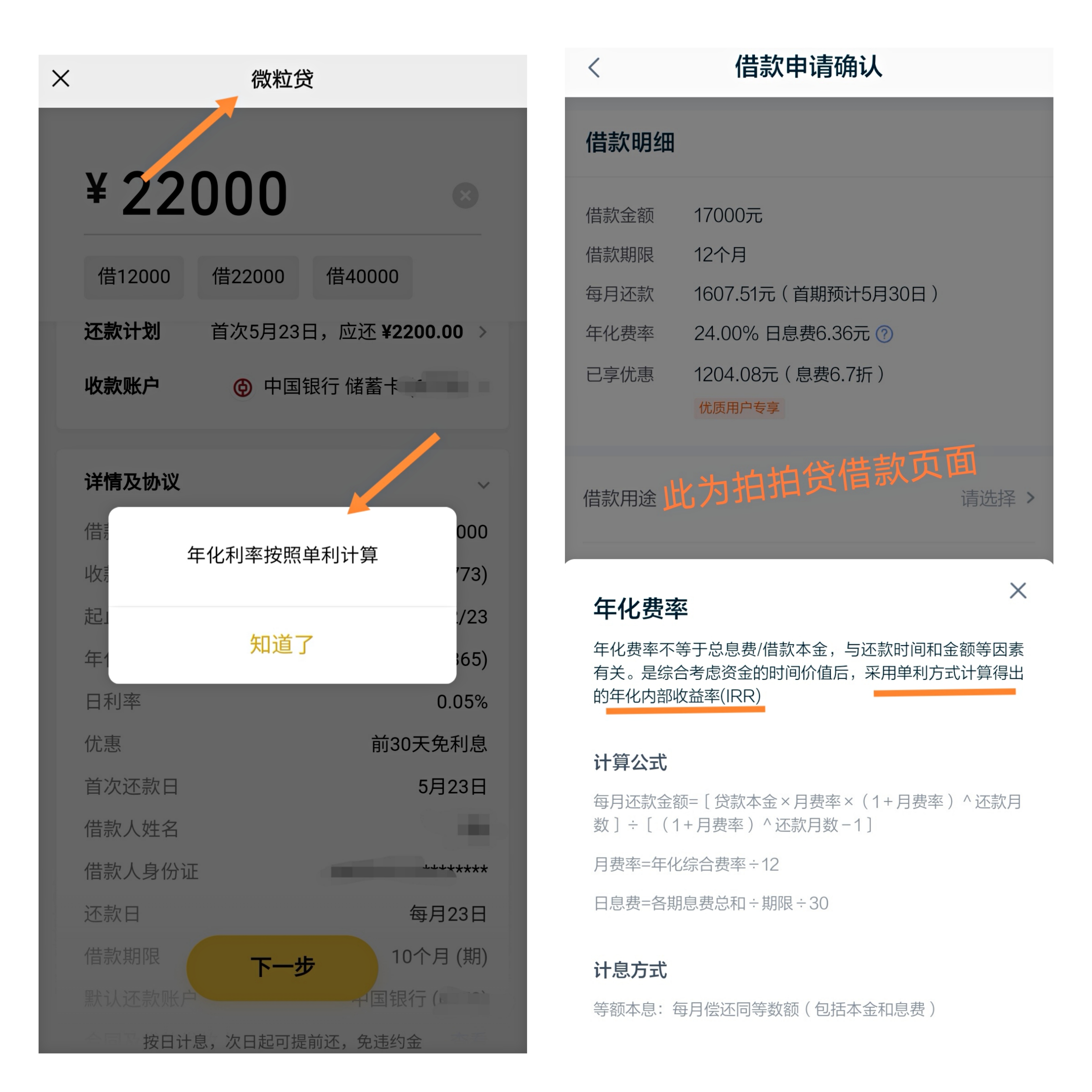 界面新闻记者发现,虽然多家贷款机构注明了年利率,但仍存在整改不到位的情形,如各家贷款机构普遍采用单利计算方式,且未按规定进行如实说明。在选取的测试对象中,仅微粒贷、拍拍贷借款在确认借款前分别注明了单利计算方式,其余均未说明。