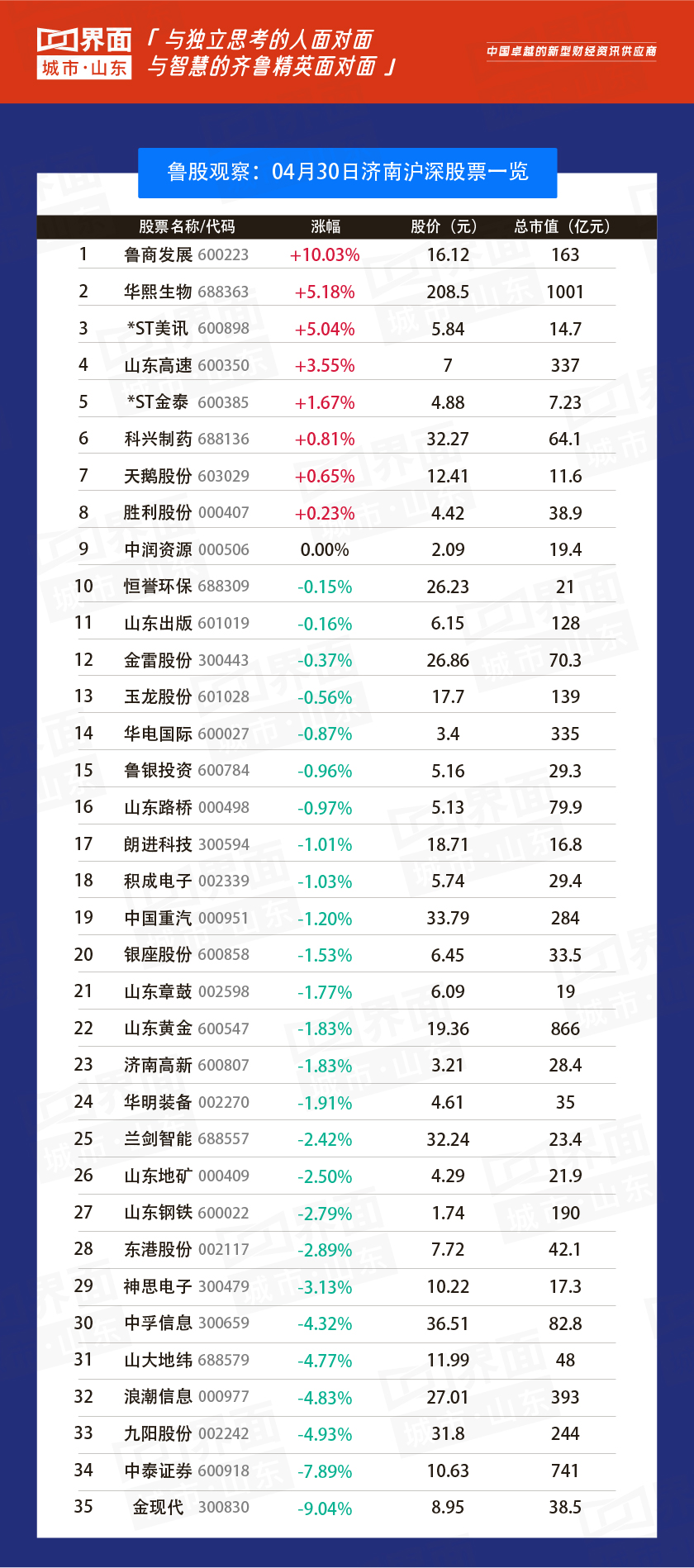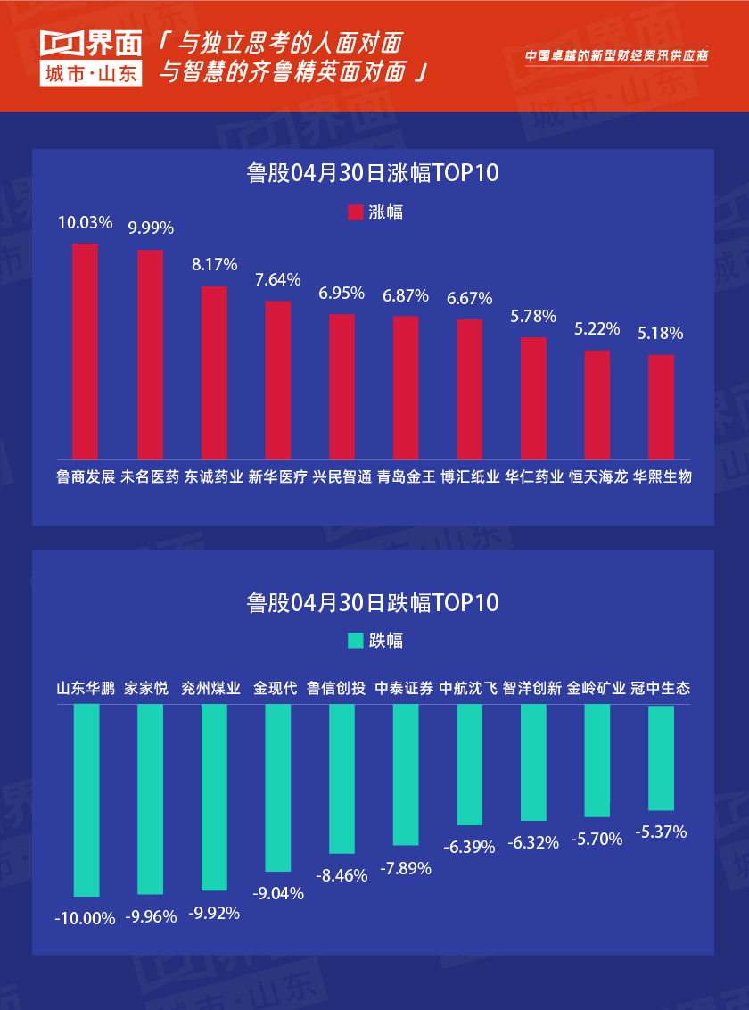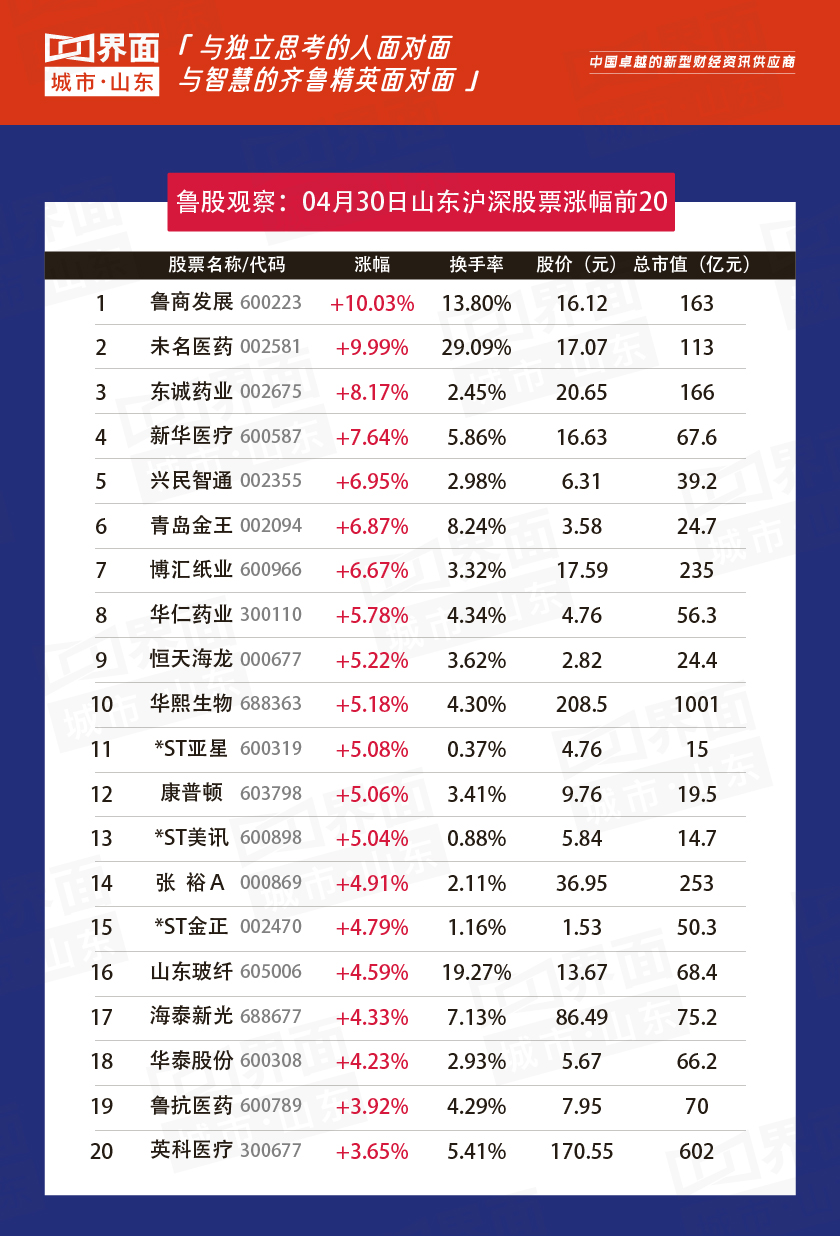 4月30日,山东90股上涨,6股持平,137股下跌。