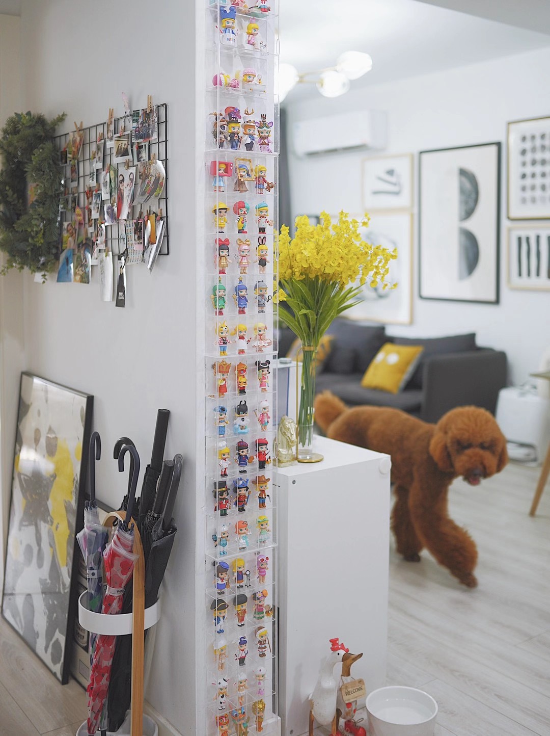 家居博主鬼马真也有一面收纳盒拼成的墙,不过是“娃墙”。大约从3年前开始,鬼马真迷上了泡泡玛特的Molly系列,只要路过泡泡玛特的店铺或者自动贩卖机,她就会抽一个Molly娃娃的盲盒。盲盒买了太多无处收纳,于是鬼马真在2020年9月定做了4组亚克力收纳盒,把娃娃统一安置在客厅玄关占地不足1平方米的窄墙上。
