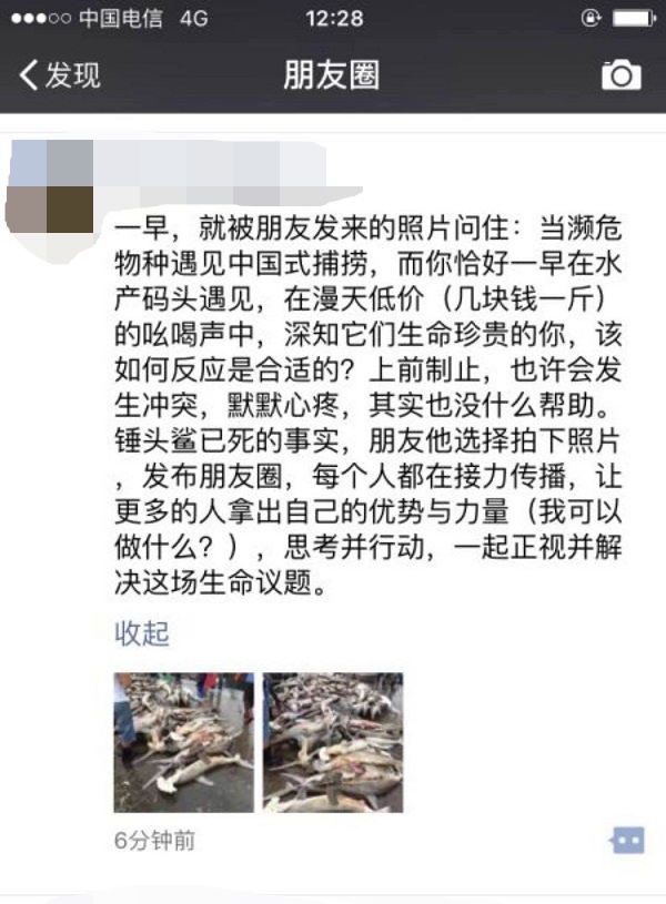 4月9日,微信朋友圈中发出图文消息:三亚水产码头当街低价售卖濒危保护动物锤头鲨,数量达近百条。消息迅速在朋友圈引发关注和热议。