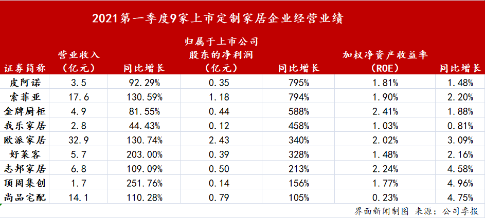 进入2021年,受益于市场需求恢复和疫情的有效控制,定制家居板块迎来强势增长。据界面新闻梳理发现,目前,欧派家居、索菲亚、尚品宅配、志邦家居、好莱客、金牌厨柜、皮阿诺、我乐家居、顶固集创等9家上市定制家居企业在一季度均取得不错表现。