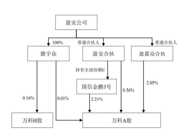 4月29日,万科发布公告称,获德宇众实业及其一致行动人盈安合伙、盈嘉众合伙“举牌”,累计持股达到5%。公告显示,德宇众实业为深圳市盈安财务顾问有限公司(下称“盈安公司”)的全资子公司,后者是万科事业合伙人集体委托管理经济利润奖金集体账户的第三方。