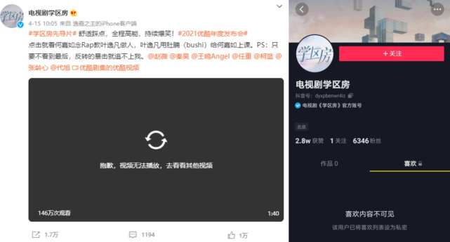 与此同时,雷达财经注意到,赵薇主演的电视剧《学区房》先导片也遭下架,该视频最初由微博账号“电视剧学区房”发布,下架前已有146万播放量。抖音账号“电视剧学区房”作品也遭清零,其主页显示账号已获得了2.8万点赞,有6346名粉丝。