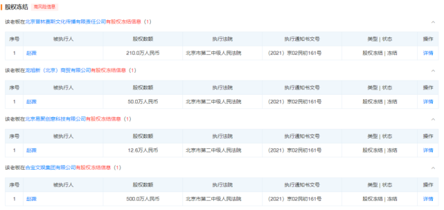 据此来看,赵薇在上述四家公司的所有股权已悉数被冻结,冻结期限至2024年4月,且四项冻结的执行通知书文号相同,执行机构均为北京市第二中级人民法院。