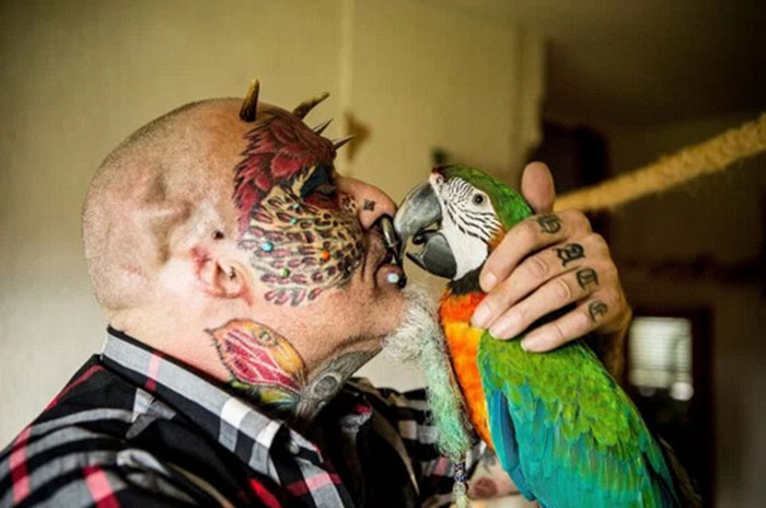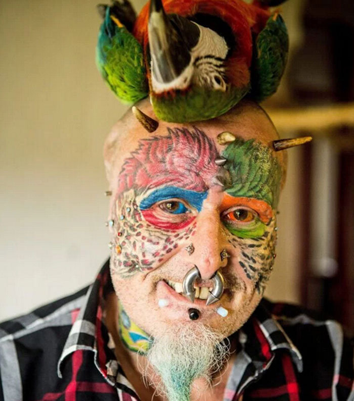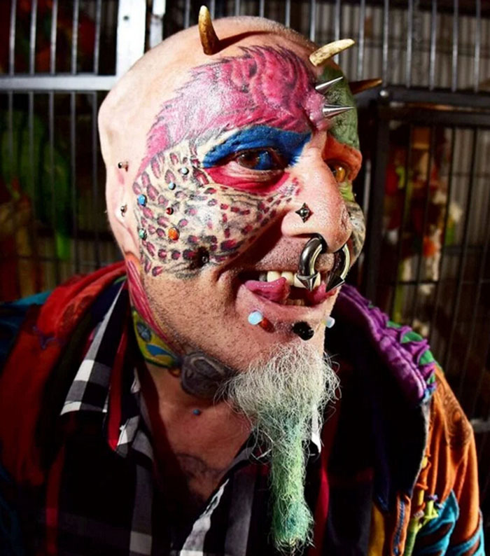 他的身上有110处文身,50个穿孔,而且还做了蜥蜴舌头。他通过手术移除了两只耳朵,给眼球染了颜色,并且给自己移植了犄角,这样他看起来就更像是一只鸟了。