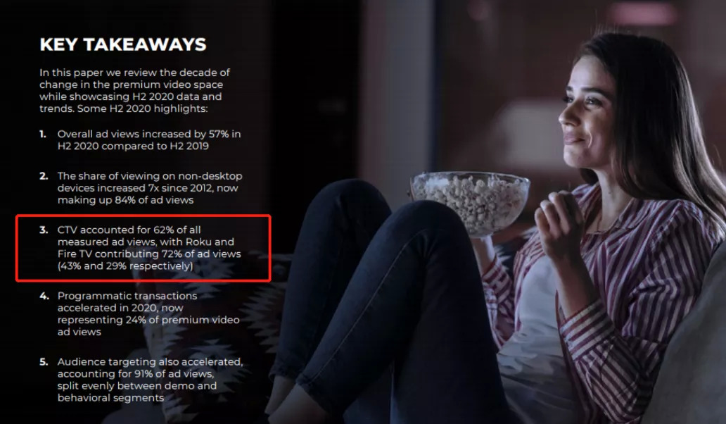 此外,康卡斯特(Comcast)旗下的FreeWheel《美国视频市场报告》显示,过去十年来,消费者已经回归到客厅观看电视,联网电视(CTV)在这一转变中扮演了重要角色。目前CTV占所有可衡量广告曝光量的62%,其中Roku和Fire TV贡献了CTV里72%的广告曝光量(分别为43%和29%)。
