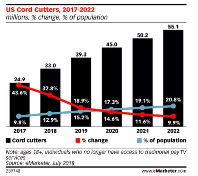 根据eMarketer的研究,由于传统有线电视和卫星电视费用不断上涨,美国每年有数百万人通过电视终端使用流媒服务,年增速持续高于10%,预计2021年将达到5000万人规模,2022年达5500万人。