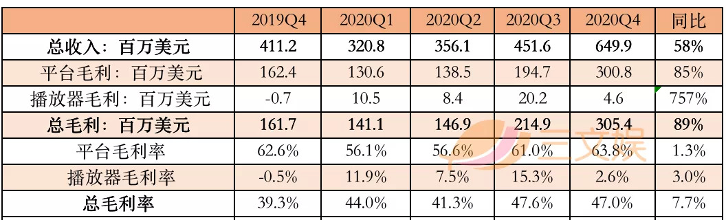 Roku第四季度营收6.5亿美元,同比(去年同期4.1亿美元)增长58%;毛利润3.1亿美元,同比(去年同期1.6亿美元)增长89%;毛利率为47%,去年同期为39%。