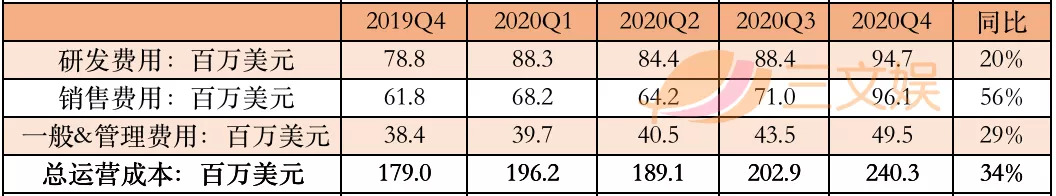 需要指出的是,Roku的日常营运支出也有明显的增长,总计2.4亿美元,同比增长34%。其中研发费用、市场营销费用、一般管理费用分别增长20%、55%、29%。其中市场营销费用的增速基本匹配了用户数和使用总时长的增速。