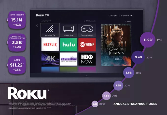 同年,Roku递交了招股书并上市。招股书披露,Roku拥有1510万活跃用户,2017年H1总观看时长达67亿小时。
