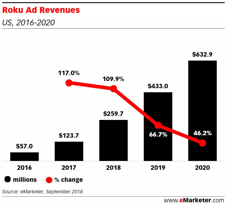 伴随着这一趋势,Roku明确了以提高用户规模、观看时长和ARPU为核心的战略并不断推进。2017年的Roku推出了自助广告产品,允许广告客户向Roku的用户投放视频广告、交互视频广告、促销活动和品牌赞助等各类广告。eMarketer认为,Roku此举提高了广告库存的货币化效率,从此开始了良性的商业化路径。