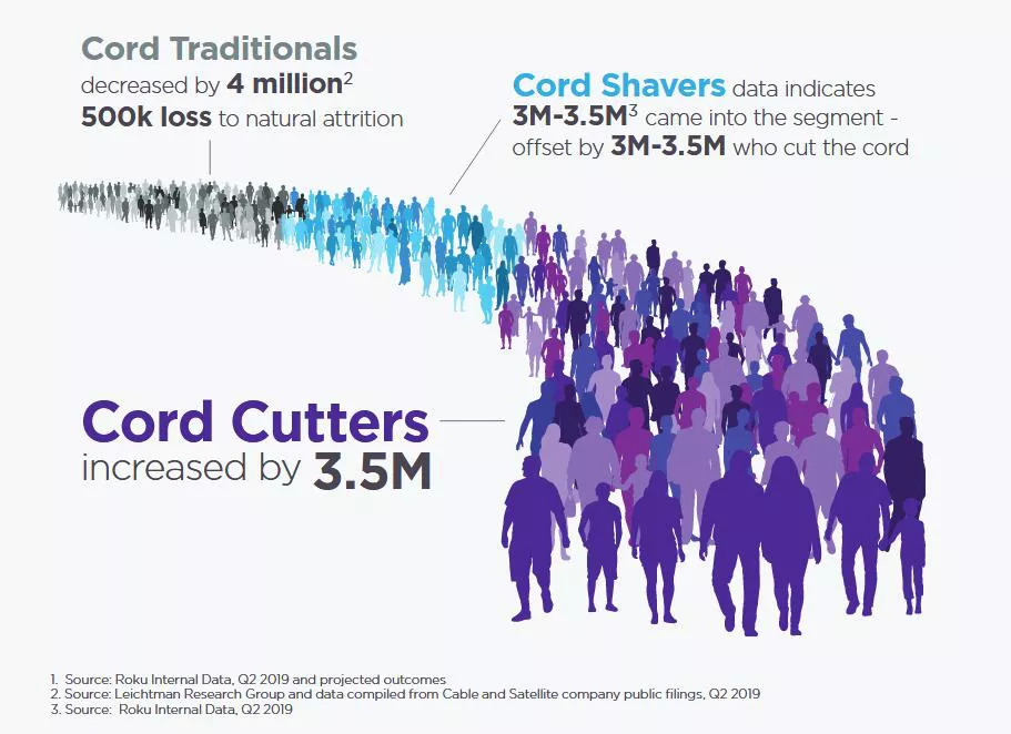 Roku描述,2020年,由于疫情导致活动节目减少,以及传统有限电视观众的人口结构老化,传统电视的行业体系正在被打乱。三大广播电视网的用户年龄中值现在超过60岁,部分原因是年轻观众转向流媒体。