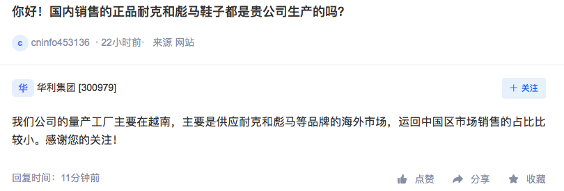 华利集团5月1日在互动易上表示,公司的量产工厂主要在越南,主要是供应耐克和彪马等品牌的海外市场,运回中国区市场销售的占比比较小。