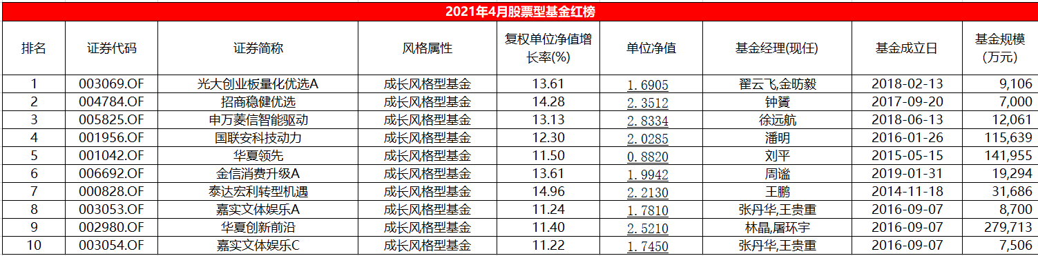 界面新闻综合收益率、波动率、择时与选股等维度对基金进行评估,同时对上榜基金进一步筛选,剔除资产规模合计低于五千万,以及成立时间不超过一个月的基金,并排除非投资收益原因造成的净值上涨,整理形成4月份股票型基金红黑榜。通过对这些基金长期跟踪,试图从中找到收益相对较高、风险相对较低,长期业绩优秀的基金。同时找出部分产品存在的潜在风险和问题,帮助投资者“避雷”。