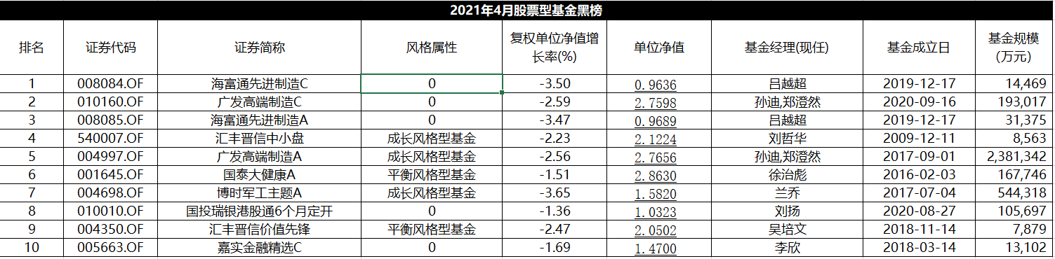 博时军工主题则位居黑榜的第7位,该基金4月份收益率达到-3.56%。