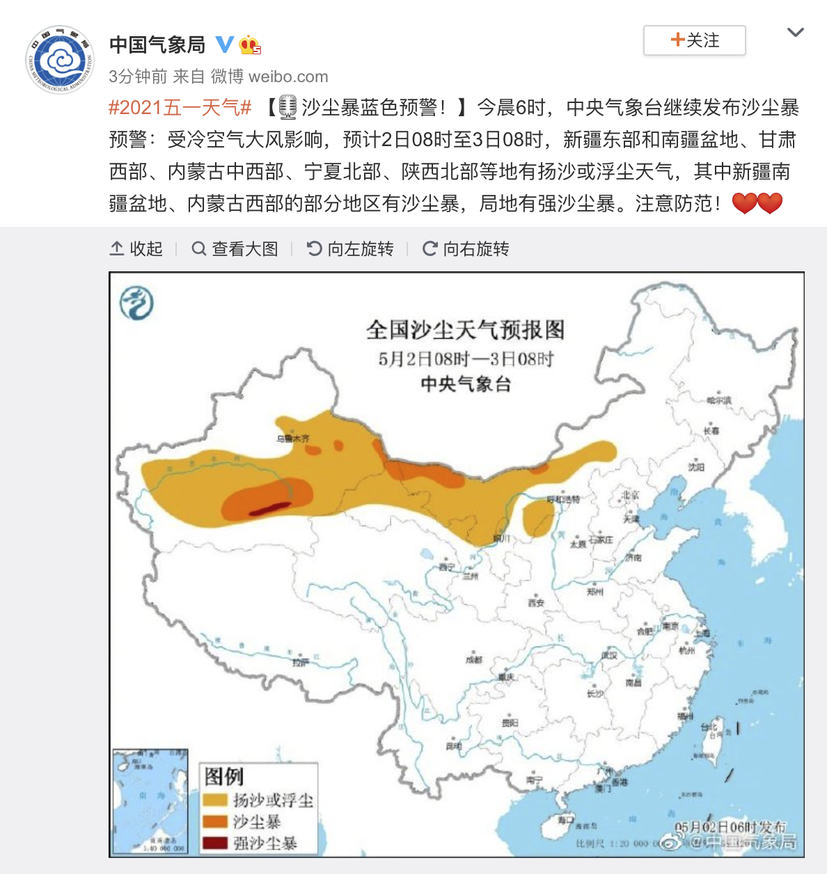 @中国气象局 微博消息,今晨6时,中央气象台继续发布沙尘暴预警:受冷空气大风影响,预计2日08时至3日08时,新疆东部和南疆盆地、甘肃西部、内蒙古中西部、宁夏北部、陕西北部等地有扬沙或浮尘天气,其中新疆南疆盆地、内蒙古西部的部分地区有沙尘暴,局地有强沙尘暴。